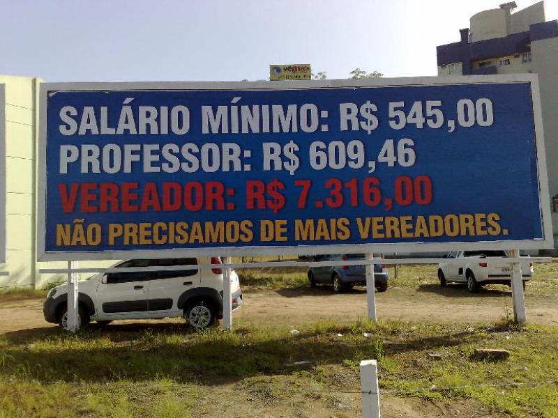 O outdoor colocado na rua Olívio Domingos Brugnago, no bairro Vila Nova, em Jaraguá, Santa Catarina, demonstra a indignação sobre a proposta de aumento do número de vereadores na Câmara. Na Ilha da Figueira, bairro de Jaraguá do Sul, também foi colocado um outdoor” (Fonte: Geral José e encaminhado por PMF)