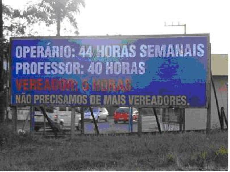 O outdoor colocado na rua Olívio Domingos Brugnago, no bairro Vila Nova, em Jaraguá, Santa Catarina, demonstra a indignação sobre a proposta de aumento do número de vereadores na Câmara. Na Ilha da Figueira, bairro de Jaraguá do Sul, também foi colocado um outdoor” (Fonte: Geral José e encaminhado por PMF)