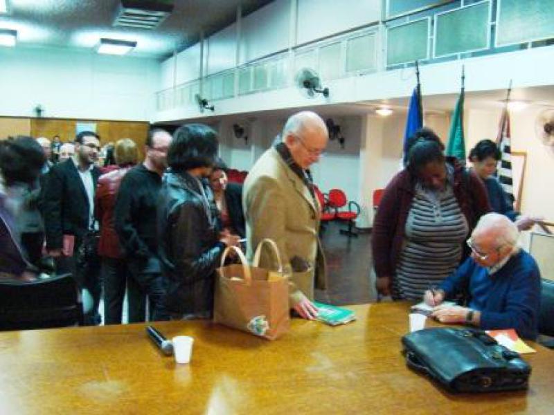 No final o público aplaudiu-o em pé e uma enorme fila se fez para que ele desse autógrafos nos seus livros expostos e vendidos na entrada pela Livraria Toque de Letras.