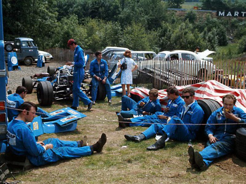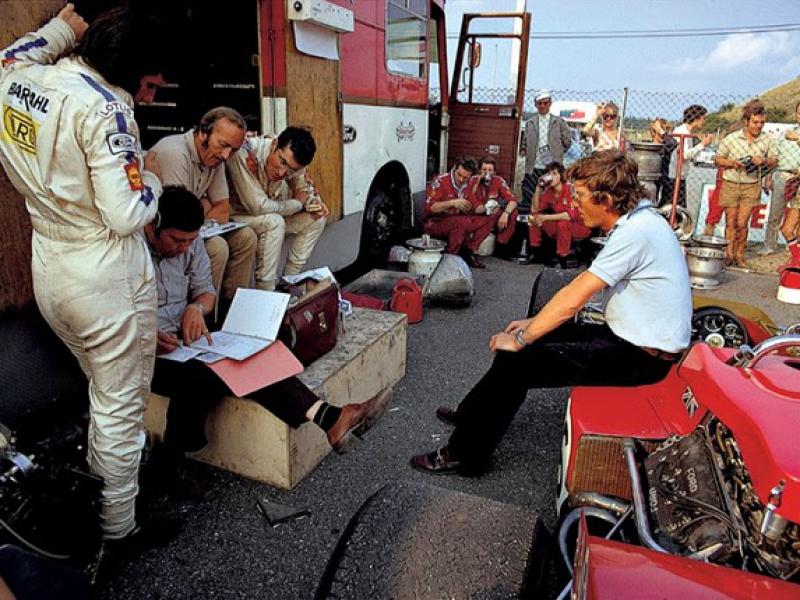 Reunião no ”motorhome” da Lotus, Hockenheim 1970.