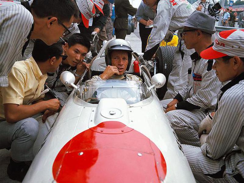 Mecânicos da Honda (uniformes de beisebol) em Monza 1966. No ano anterior haviam conseguido a primeira vitória na F-1, no México.