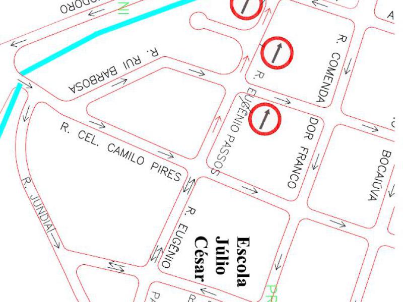 Os motoristas devem ficar atentos. A partir de segunda-feira, dia 4, a Rua Eugênio Passos passará a ser mão única no trecho entre a Rua Coronel Camilo Pires e a Avenida Marechal Deodoro, com trânsito somente no sentido Centro-Bairro