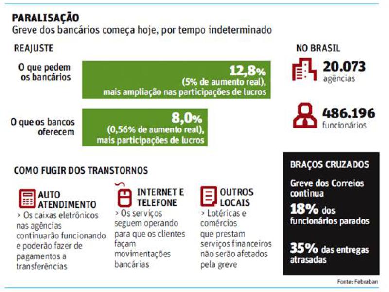 Os bancários pedem reajuste de 12,8% e maior participação nos lucros das empresas. Isso significa aumento real de 5%, se descontada a inflação.
