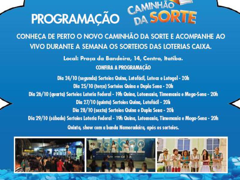 O caminhão ficará estacionado na Praça da Bandeira até o próximo sábado, dia 29 de outubro, trazendo sorte nas comemorações dos 154 anos de Itatiba. Serão realizados ainda sorteios da Lotofácil, Federal, Quina, Dupla Sena, Loteria Federal, Lotomania, Mega Sena e Time Mania, sempre com muita animação e distribuição de brindes.