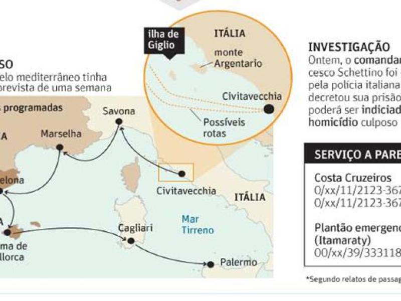 O comandante Francesco Schettino foi detido ontem em Grosseto na Itáia. Ele é acusado de homicídio culposo (quando não há intenção) múltiplo, de ter provocado um naufrágio e de ter abandonado o navio quando ainda havia várias pessoas a serem salvas.