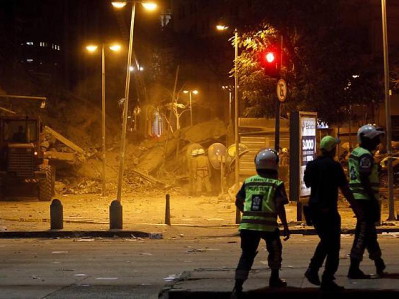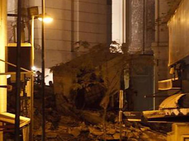 Os três prédios localizados ao lado do Theatro Municipal desabaram por volta das 20h30. O teatro não foi atingido, mas seu anexo, onde funciona a bilheteria, sofreu danos por causa dos escombros.
