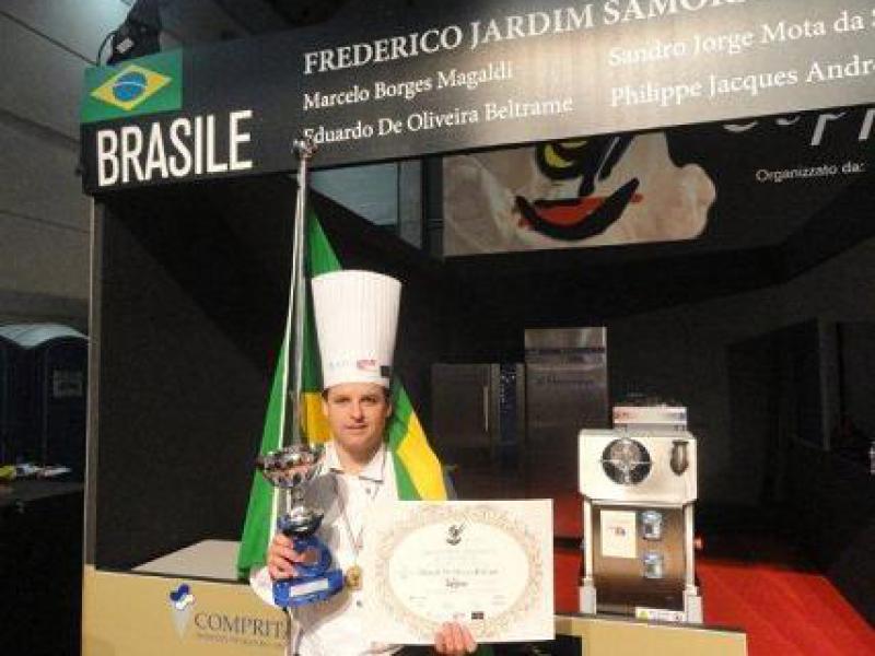 Na equipe que representava o Brasil estavam Frederico Samora, chef gelatiere e vice-presidente da Associação Brasileira dos Confeiteiros e Sorveteiros (Abraces); Philippe Soffieti, chefe confeiteiro; Sandro Mota, chef de cozinha; e Marcelo Magaldi e Eduardo Beltrame, mestres confeiteiros. Beltrame é professor voluntário do Centro de Capacitação Solidária, do Fundo Social de Solidariedade da cidade de Itatiba.