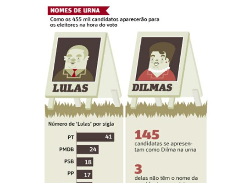 No manancial de dados há uma coleção de informações curiosas. Três candidatas que não têm "Dilma" no nome de batismo adotam a alcunha na urna. "Lula" são 270 --17 deles do PSDB e 10 do DEM. Dois candidatos a vereador de siglas de oposição ao governo federal adotaram o nome "Mensalão" (confira nas fotos abaixo). O do DEM, porém, teve o pedido de registro negado. (Fonte: Folha)