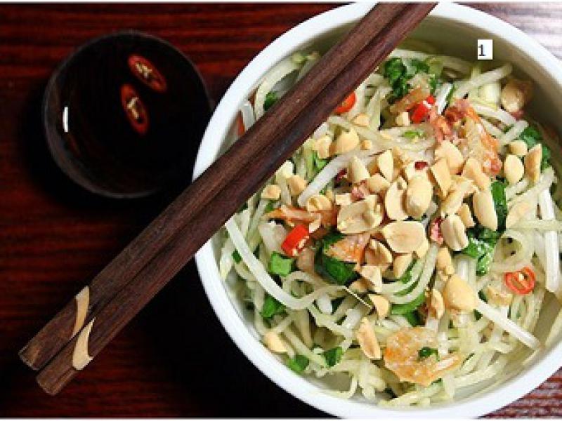 A cidade Tailândesa foi considerada a melhor cidade para se comer na rua por conta da variedade de opções, uma delas é a salada de mamão verde (foto) com frango ao curry e arroz com manga. (Fonte: Fabiana Pimentel/Money)