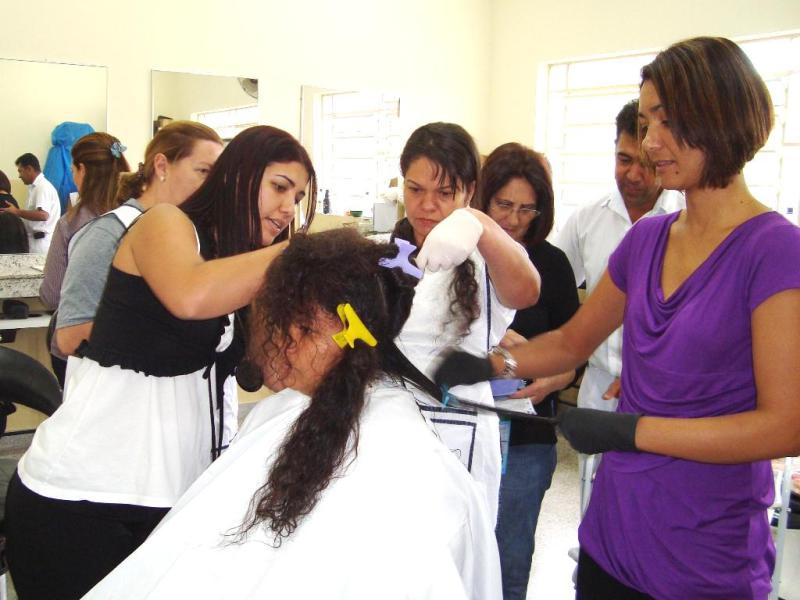 Profissionais explicam para alunos do curso de cabeleireiro as técnicas para a realização da escova progressiva. Os 20 alunos aprenderam as técnicas deste procedimento