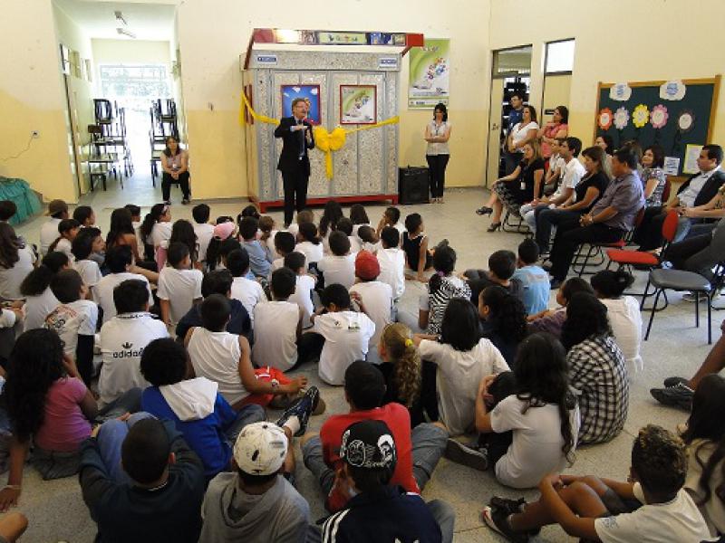 Trata-se da doação de 500 livros de literatura infanto-juvenil, que ficarão no pátio da escola, no espaço Ecoteca, uma espécie de banca de jornais feita com materiais reciclados. Os títulos foram escolhidos pela equipe gestora da escola e patrocinados pela empresa BorgWarner.