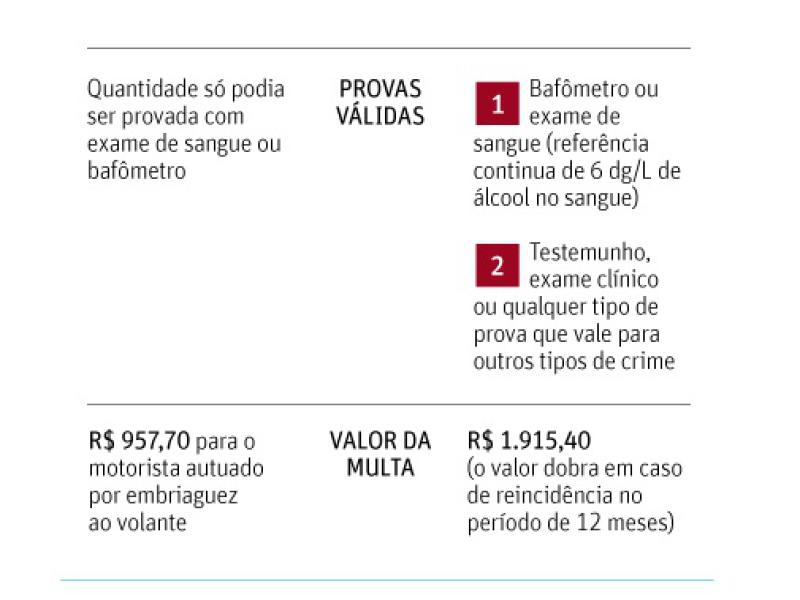 Antes da mudança, era considerado crime dirigir sob a influência de drogas e álcool -a proporção é de 6 dg/L (decigramas por litro) de sangue-, mesmo sem oferecer risco a terceiros e o índice só pode ser medido por bafômetro ou exame de sangue.