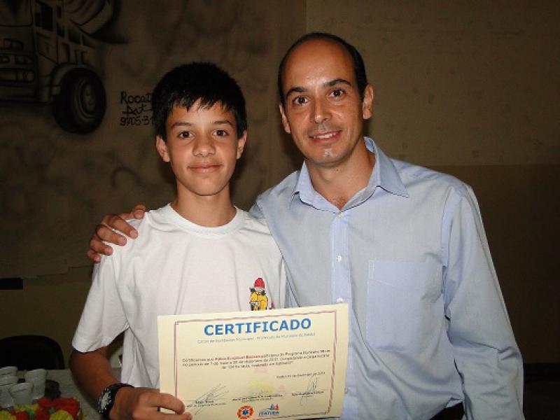 Após um vídeo com imagens das 12 turmas de formandos, os instrutores Montico, Auricele, Eliana, Carlos, Elísio e Fátima foram homenageados e os formandos receberam seus diplomas das mãos de seus padrinhos. “O Fábio aprendeu muita coisa, não só em primeiros socorros, mas na prevenção e combate a incêndios. São coisas que ele vai levar pelo resto da vida...”, comenta Antonio Augusto Bassan, 39 anos, Centenário, pai do Bombeiro Mirim Fábio Emmanuel Bassan, 14 anos...