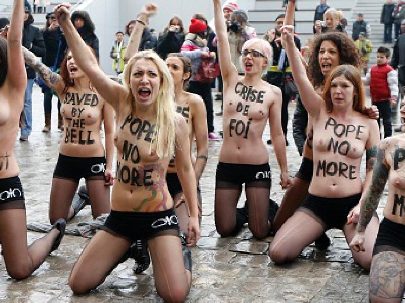 Foto: Ativistas do Femen protestam em frente à Catedral de Notre-Dame, em Paris (França), para celebrar a renúncia do papa Bento 16 e a decisão do Parlamento francês de aprovar proposta de lei que permite o casamento homossexual