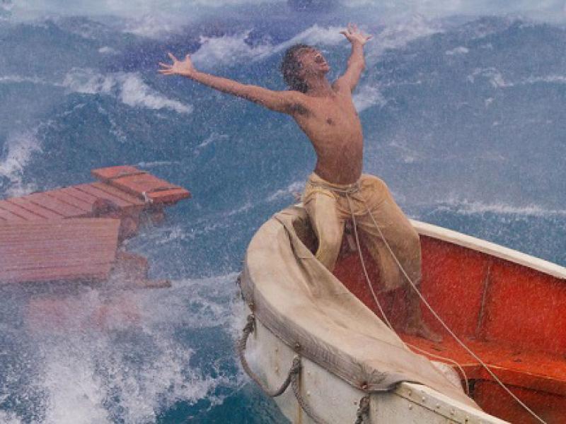 Numa das cenas mais dramáticas do filme, Pi é o único sobrevivente do naufrágio, e fica perdido no meio do oceano Pacífico, com um tigre de bengala chamado Richard Parker, uma zebra, um orangotango e uma hiena dopada por mais de 200 dias. O filme é baseado no livro de 2001 de Yann Martel, vencedor do prêmio 'Book Prize'.