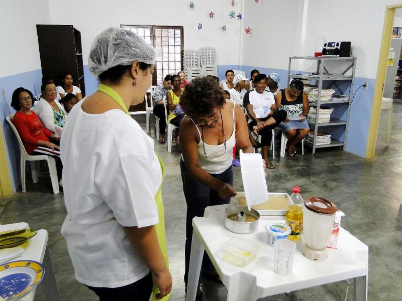 Os participantes aprendem receitas com produtos da cesta básica, como arroz, virado com couve, broa de fubá, pão caseiro, bolos, arroz a grega, escondidinho e arroz doce