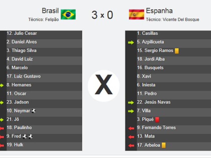 Apoiado por mais de 73 mil vozes, o Brasil de Luiz Felipe Scolari desconstruiu a grande Espanha da história com uma apresentação tática brilhante, com placar de 3 a 0. Diante do time mais vencedor dos últimos anos, ressurge o melhor do futebol nacional no tetracampeonato do torneio da Fifa. Fred, duas vezes, e Neymar garantiram a festa dos donos da casa.