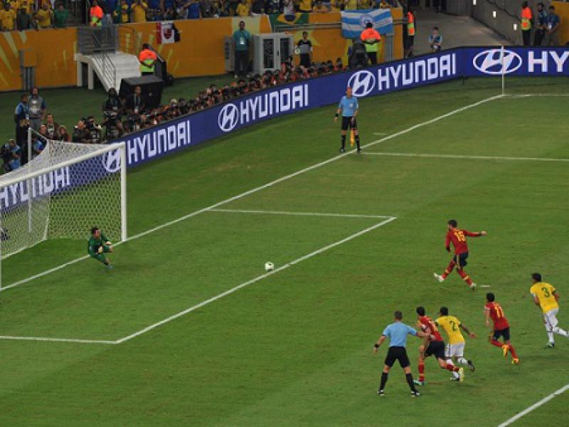 A Espanha parecia ter uma chance de mexer com o jogo aos 9min, quando Marcelo cometeu pênalti infantil em Jesus Navas. Julio Cesar acertou o canto escolhido pelo zagueiro Sergio Ramos, mas não precisou nem esticar a mão, bastou ver a bola sair pela linha de fundo em uma péssima cobrança.