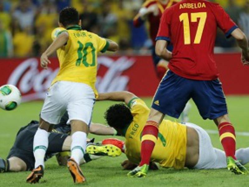 O Brasil desconstruiu o estilo espanhol de dominar a partida, com marcação pressão na linha de intermediária de ataque. Até Fred combatia a saída de jogo dos rivais, forçando erros de passe tolos para a equipe que recentemente reeducou o futebol a respeito do tratamento de bola.