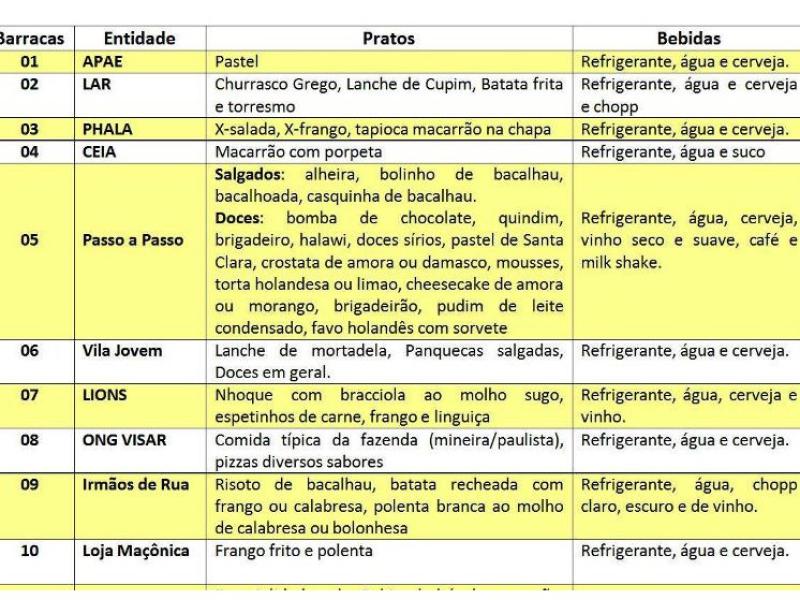 Quem passar pela Praça de Alimentação nos dias de Festa encontrará também do tradicional pastel frito na hora até uma deliciosa batata recheada. Doces, salgados e lanches estão inclusos no cardápio. Para beber, terá opções de refrigerantes, água, cerveja, chopp e vinho.