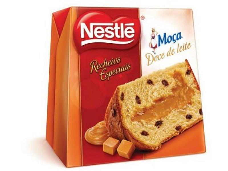 O panettone, além de ser recheado com doce de leite, possui também gotas de chocolate.