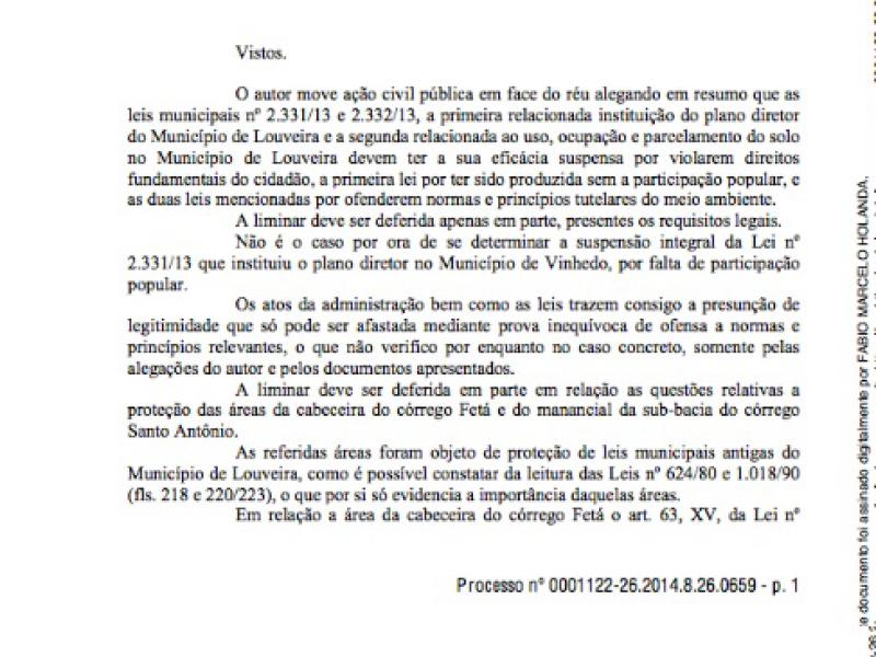"...No final da tarde desta última segunda-feira, 10 de fevereiro, o juiz Dr. Fábio Holanda da 1ª Vara de Vinhedo concedeu liminar parcial ao pedido elaborado pela Promotoria Pública sobre o Plano Diretor de Louveira