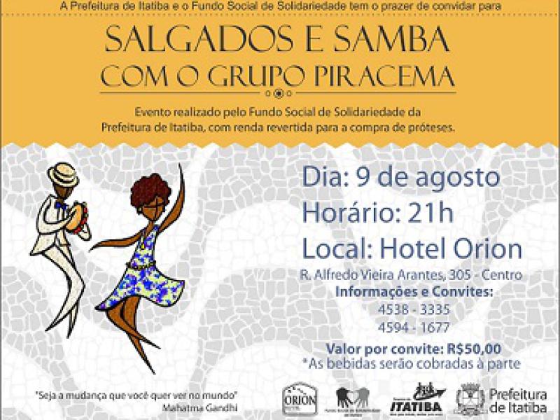 Neste sábado, dia 9 de agosto, às 21h, o Fundo Social de Solidariedade de Itatiba, realiza o evento ‘Salgados e Samba’ no salão de festas do Hotel Orion