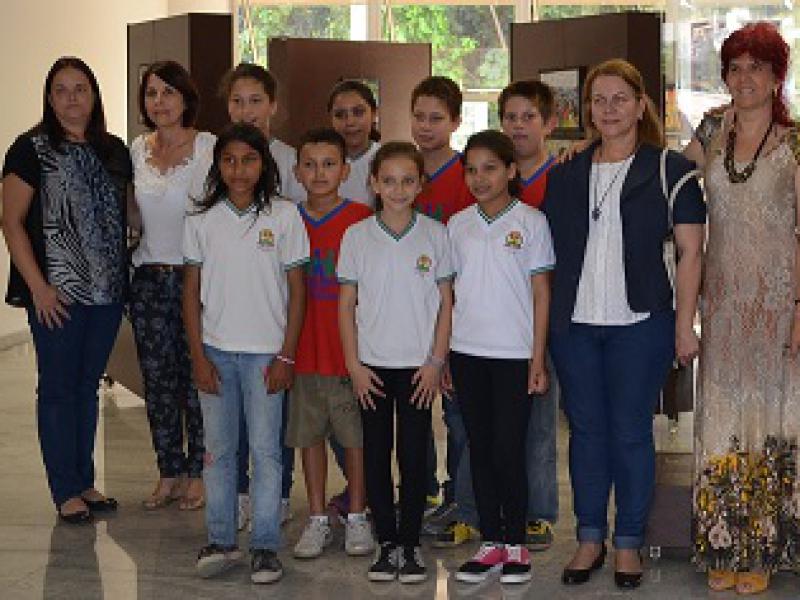 Alunos e professores da EMEB Basilio Consoline juntamente à Professora da USF, Maribel Nogueira durante evento de abertura.