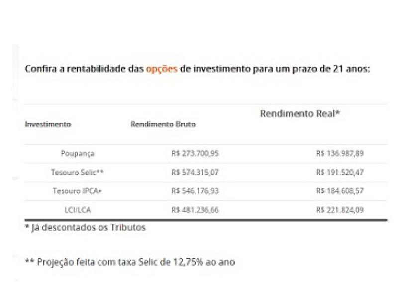 Confira a rentabilidade das opções de investimento para um prazo de 21 anos clicando nas fotos abaixo: