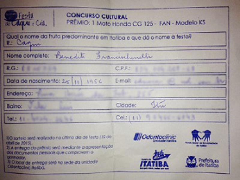 O morador de Itu-SP, Benedito Francischinelli de 58 anos, foi o vencedor do sorteio de uma moto zero km Honda CG 125 - FAN -Modelo KS, Veja os detalhes: