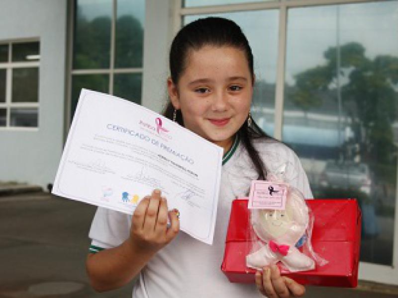 Além dos laços, um concurso que ocorreu entre alunos da rede municipal de ensino por todo mês de setembro resultou em um desenho e um nome do mascote, um simpático e humanizado lacinho rosa feito em feltro pela equipe das aulas de Patchwork do Fundo Social de Solidariedade.