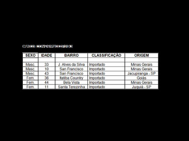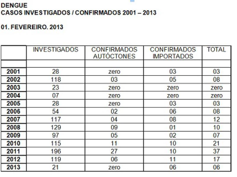 Segundo a municipalidade, "A Dengue pode se manifestar de duas formas: a Dengue Clássica e a Dengue com Complicações. Na forma clássica, os principais sintomas são febre elevada, dores musculares e nas articulações, dor atrás dos olhos, dor de cabeça intensa e sensação de cansaço, desânimo. Pode haver sangramento gengival, nasal e manchas vermelhas pelo corpo.