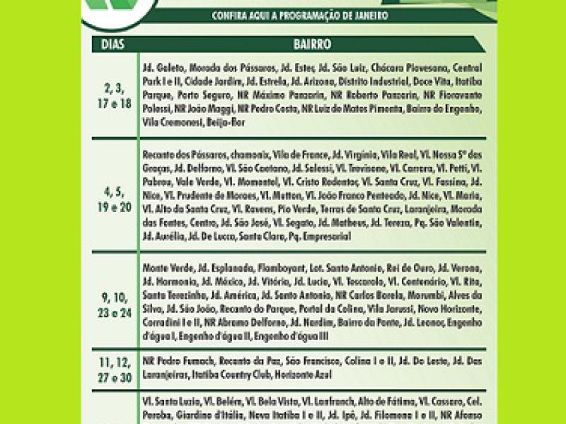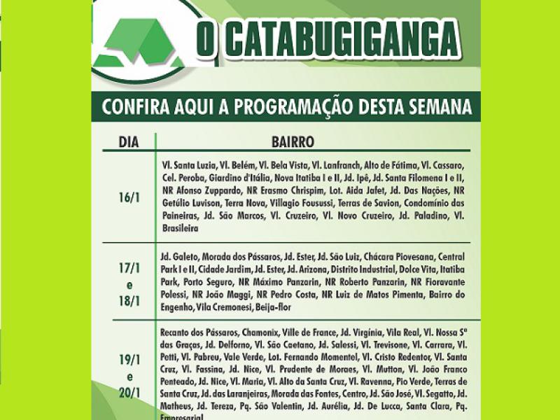 O Catabugiganga deve ocorrer pelos próximos meses, seguindo um cronograma desenvolvido para atender todos os bairros de Itatiba. Neste cronograma, a Prefeitura divulgará em quais dias e bairros os caminhões passarão.