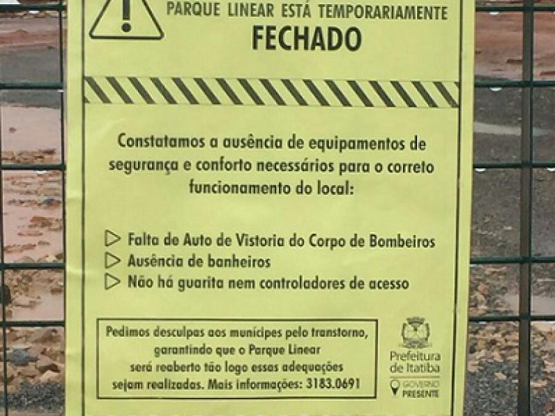 "A Prefeitura de Itatiba fechará a partir desta quinta-feira, dia 02 de fevereiro, temporariamente o Parque Linear ‘Antônio Fattori’ após constatar a ausência de equipamentos de segurança e conforto necessários para o correto funcionamento do local," afirma assessoria do Prefeito Douglas