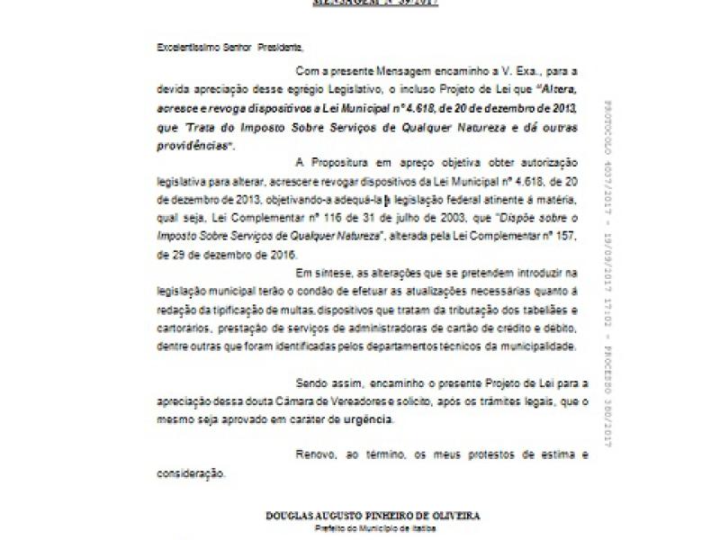 O prefeito Douglas Augusto apresentou o projeto e, em seguida, protocolou emenda modificativa ao texto, para melhor adequar os valores da alíquota sobre o preço do serviço e o valor fixo anual pago pelo prestador, bem como adequar e esclarecer outras situações.