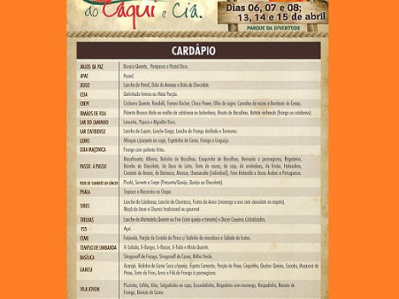 “Sabemos que as opções gastronômicas oferecidas na Festa do Caqui são um diferencial importante”, comentou o Secretário de Cultura e Turismo, Washington Bortolossi. “Nós tomamos o cuidado de elaborar um cardápio bem variado, sem repetição entre as barracas, que é para agradar todos os gostos. E como este ano teremos seis dias de festa, dá para experimentar bastante coisa”, finalizou.