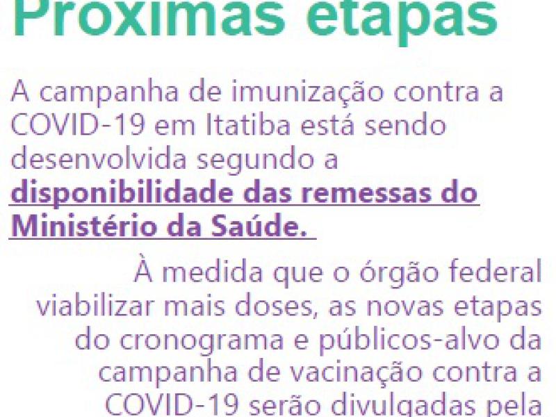 Ainda segundo a Prefeitura, "Entre profissionais de saúde, idosos institucionalizados e quilombolas, Itatiba tem população estimada de 3.720 pessoas. A primeira remessa de vacinas, de 1360 doses - e outras 1360 daqui 21 dias, para a segunda dose dos primeiros vacinados -, imunizará parte desses cidadãos. A expectativa da Prefeitura de Itatiba é receber novas doses na próxima semana."